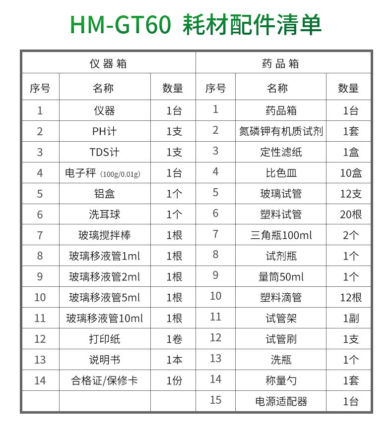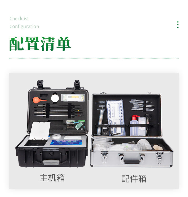 配套齊全:該儀器集藥、器、儀為一體,攜帶方便,相當(dāng)于一個小型移動實驗室,無需用戶自配附件,亦可靈活野外流動測試。適于農(nóng)業(yè)服務(wù)部門或農(nóng)資經(jīng)銷商、高教院校、科研院所、合作社、肥料廠商、大種植戶測土施肥和鑒別肥料真假及環(huán)保檢測應(yīng)用。