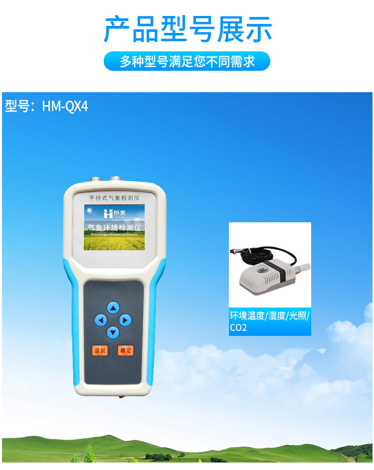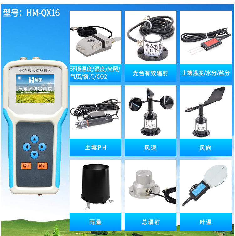 手持式智能農業氣象環境檢測儀是我們專門針對農田、草場局部小尺度環境設計的,對與植被和農作物生長密切相關的土壤、水氣等環境參數監測的農田小氣候站。它主要觀測與農業相關的空氣溫度、空氣濕度、光照強度、二氧化碳濃度、露點溫度、光合有效輻射、土壤溫度、土壤水分、土壤鹽分、土壤PH、風速、風向、降雨量、大氣壓力、總輻射、葉面溫度等16個環境參數氣象要素,為農業科研、農業生產等提供良好的支持。